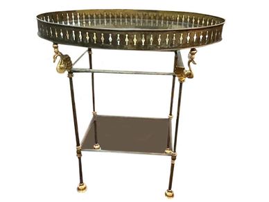An English style round side table with red paint. Pie crust top and three legs with brass caps.